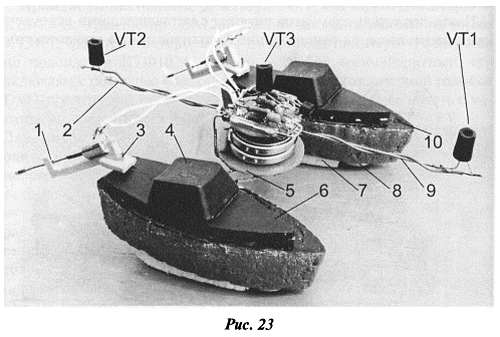 Пластмассовое основание 6 вырезают в форме пули из прямоугольного куска чёрной пластмассы размерами 20x55 мм и толщиной 3 мм. Поплавок 10 из пенопласта размерами 13x25x65 мм вырезают терморезаком. Его окрашивают масляной краской, а на пластмассовое основание наклеивают рубку 4 (пластмассовая клавиша от компьютерной клавиатуры). Сбоку в основании делают два отверстия для вклеивания платы-перемычки 5, затем основание приклеивают к поплавкам. Двигатель 1 крепят к основанию 6 с помощью отрезков 3 канцелярских скрепок. Фототранзисторы VT1 и VT2 закреплены на выносных балках 9 и 2, которые припаяны к печатной плате, на которой размещён VT3. На все фототранзисторы надеты световые экраны — отрезки изоляции шнура от компьютерной клавиатуры.