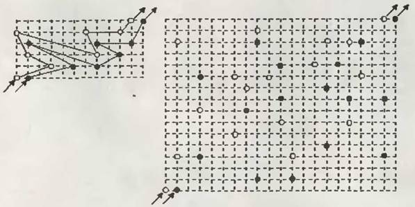 Двойной путь: На карте отмечены места стоянок Белых и Черных. Восстановите их маршруты, если известно, что две соседние стоянки всегда соединяются прямыми и их маршруты не касаются и не пересекают ни себя ни друг друга (см. например).