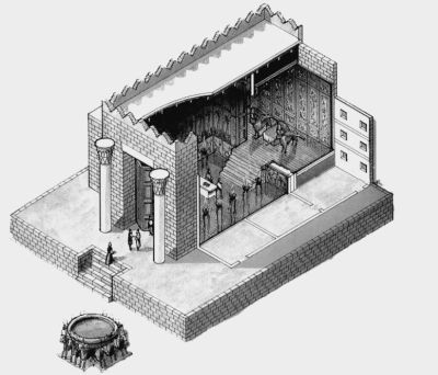 В общем, Храм Соломона был построен по плану, данному для скинии Моисеевой, только в больших размерах и с теми приспособлениями, какие были необходимы в богатом неподвижном святилище. Храм разделялся на Святая Святых, святилище и притвор, но был обширнее и великолепнее скинии.