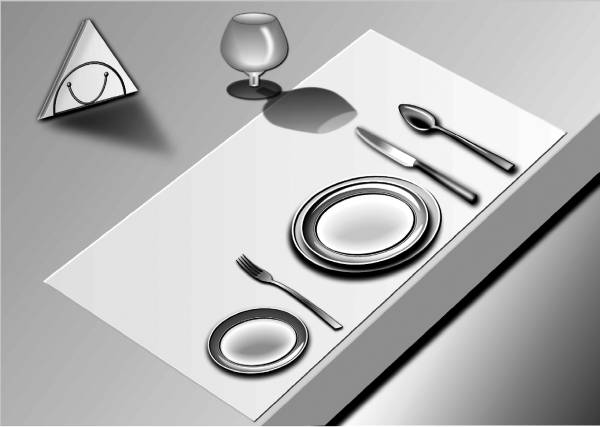 Сервировка обеда по меню дежурных блюд. При обслуживании днем по меню дежурных блюд на стол ставят подставочную тарелку и на нее – закусочную, слева от нее – пирожковую тарелку, между ними кладут столовую вилку, а справа от тарелки столовый нож и ложку (столовую или десертную). Фужер ставят впереди, за столовым ножом. На столе должны быть также вазочка с бумажными салфетками или полотняные салфетки, которые кладут на закусочные тарелки, специи. Расстояние от края стола до ручек приборов и закусочной тарелки – 2 см, а до пирожковой – 5 см. Закусочные или столовые тарелки ставят лишь в том случае, если блюда подаются в посуде, из которой есть не принято.