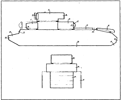 1 — направляющее колесо; 2 — 76-мм пушка; 3 — 37-мм пушка; 4 — вращающаяся башня; 5 — неподвижная рубка; 6 — кормовой пулемёт «максим»; 7 — поддерживающий каток; 8 — гусеничная цепь; 9 — ведущее колесо; 10— опорный каток; 11 — бортовая установка пулемёта ДТ; 12 — люк для посадки экипажа; 13 — смотровой прибор механика-водителя; 14 — бортовой пулемёт «максим»; 15 — стробоскоп.
