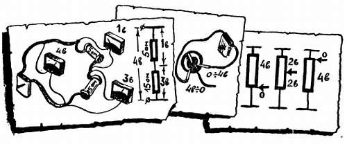 Если вы хотите убедиться в том, что усвоили понятия «делитель» и «шунт», попробуйте составить несколько эквивалентных схем (все детали представлены резисторами) уже знакомой нам цепи (рис. 41, листок А), состоящей из лампочек, выключателей и диодов. Составьте эквивалентные схемы этой цепи для всех возможных комбинаций включения и выключения Вк1 и Вк2, причем для обоих полупериодов. При этом считайте, что прямое сопротивление диода равно 2 ом, обратное — 20 ком и сопротивление лампочки — 200 ом.