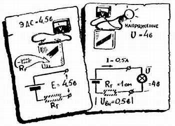 Пример. У старых батареек Rг сильно возрастает, и напряжение, которое дает такая батарея под нагрузкой, уменьшается. В то же время при отключенной нагрузке, когда ток через Rг практически не идет, вольтметр показывает у старых батарей нормальную э. д. с. (ток, потребляемый самим вольтметром, мал, и мы его не учитываем).