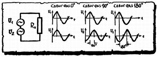 Подключим к щей нагрузке два генератора. Их переменные напряжения могут действовать согласованно (в фазе), а могут действовать и не согласованно — со сдвигом фаз. В самом страшном случае генераторы просто работают друг против друга. Положительная амплитуда у одного из них появляется на позже, чем у другого, или, иными словами, напряжения сдвинуты по фазе на 180°. Возможны и другие сдвиги фаз между разными напряжениями, а кроме того, возможен сдвиг между переменным током и создавшим его переменным напряжением.