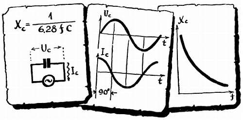 Чем быстрее меняется напряжение, тем больше ток через конденсатор, этим и объясняется уменьшение хс с ростом частоты. Теперь посмотрите на график синусоидального напряжения: быстрей всего оно меняется, когда проходит через ноль, и именно в эти моменты в конденсаторе наблюдается амплитуда тока. Когда напряжение приближается к своей амплитуде, оно растет все медленнее, наконец как бы замирает на миг и начинает уменьшаться.
