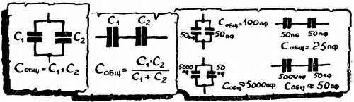 При параллельном соединении общая емкость конденсаторов равна сумме емкостей, при последовательном соединении общая емкость меньше наименьшей. Формулы для расчета общей емкости — это те же формулы для подсчета общего сопротивления (Воспоминания №№ 5 и 6), только «перепутанные»: формула для параллельного соединения R похожа на формулу для последовательного соединения С, а формула для последовательного соединения R — на формулу параллельного соединения С.