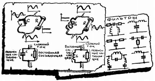 Цепи, состоящие из R и С, или R и L, или из всех трех элементов, находят чрезвычайно широкое применение в электронной аппаратуре. Они представляют собой фильтры, которые, обладая разным сопротивлением на разных частотах, позволяют отделить одни составляющие сложного тока от других.