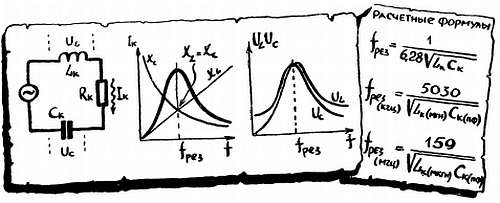 На какой-то частоте — назовем ее резонансной fрез — емкостное и индуктивное сопротивления окажутся равными. Они скомпенсируют друг друга, в цепи останется только активное сопротивление Rк. Из-за такого резкого уменьшения сопротивления резко возрастет ток, а вместе с ним возрастут напряжения на катушке и на конденсаторе.