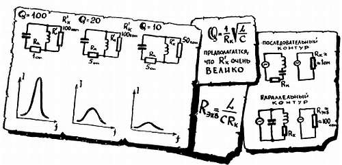 Увеличение тока при резонансе будет тем более резким, чем меньше активное сопротивление в сравнении с реактивным сопротивлением xL и хс. Величина, показывающая отношение xL/Rк или (или xс/Rк) называется добротностью Q. Добротность иногда называют множителем вольтажа, так как она показывает, во сколько раз напряжение на катушке и на конденсаторе во время резонанса превышает напряжение на активном сопротивлении. Из отношения xL/Rк — легко вывести, что добротность тем выше, чем больше соотношение L/C. Увеличение Rк всегда приводит к ухудшению добротности, а значит, к снижению резонансного тока, а также напряжения на катушке и конденсаторе и к притуплению резонансной кривой. Ухудшить добротность можно еще и иначе: подключив параллельно конденсатору (катушке) шунтирующее сопротивление. В данном случае все наоборот: чем меньше это шунтирующее сопротивление, тем сильнее «задавлен» контур, тем хуже его добротность.