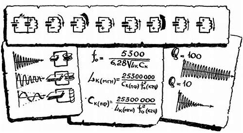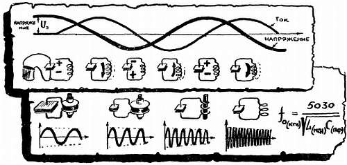 «Возникают колебания» означает, что конденсатор непрерывно обменивается энергией с катушкой — энергия электрического поля периодически переходит в энергию магнитного поля. Затем происходит обратный переход, и все повторяется сначала. При этом в цепи протекает переменный ток, частота которого зависит от индуктивности L и емкости С, подобно тому как частота собственных колебаний струны зависит от ее массы и натяжения.