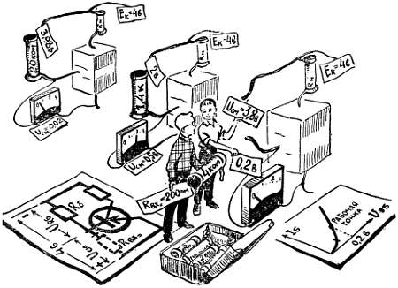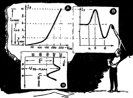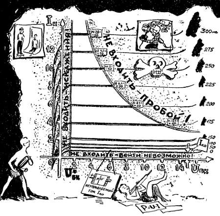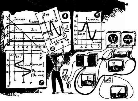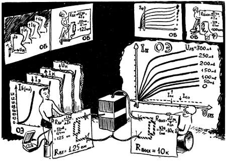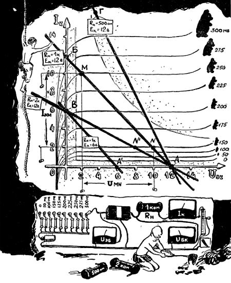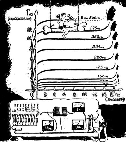 Сколько бы мы ни шутили по этому поводу, столь прочная привязанность к многочисленному семейству рисунка — к чертежам, графикам, карикатурам, картам, планам — связана со сложными и тонкими механизмами нашего мозга. Во многих случаях мозг воспринимает графические описания намного легче и быстрее, чем словесные. Во многих случаях даже очень простой рисунок нельзя заменить пространным описанием, содержащим многие тысячи слов. К числу таких содержательных рисунков наверняка можно отнести и характеристики полупроводникового триода, которые нам сейчас предстоит построить и которые мы сохраним если не на века, то, во всяком случае, на все время знакомства с транзисторными усилителями.