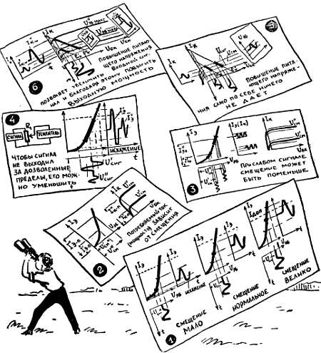 Если включить последовательно две батарейки, причем так, чтобы они действовали друг против друга, то результирующее напряжение будет равно разности напряжений, которые дают эти батарейки. Точно так же напряжение, которое получится в результате взаимодействия U'см и U''см в одной последовательной цепи, равно разности этих напряжений. При этом U'см больше, чем U''см, и на базе оказывается «минус». (Иначе и быть не может — «плюс» запер бы триод и U''см вообще исчезло бы.) А если по каким-нибудь причинам будет меняться одно из этих двух напряжений, то одновременно будет меняться и их разность — результирующее смещение Uсм = U''см — U'см.