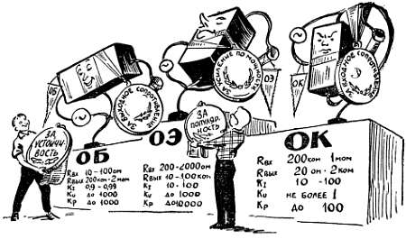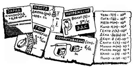 О первых трех характеристиках мы уже говорили на стр. 18. Известны также единицы, в которых измеряются сопротивление, напряжение и ток. Часто бывает удобно пользоваться более крупными и более мелкими единицами (не всегда же мы пользуемся метром — расстояние между городами удобней измерять в километрах, а диаметр провода — в миллиметpax). Как образуются производные единицы, все эти мегомы (Мом), килоомы (ком), миллиамперы (ма), микровольты (мкв) и другие, подскажет вам таблица.