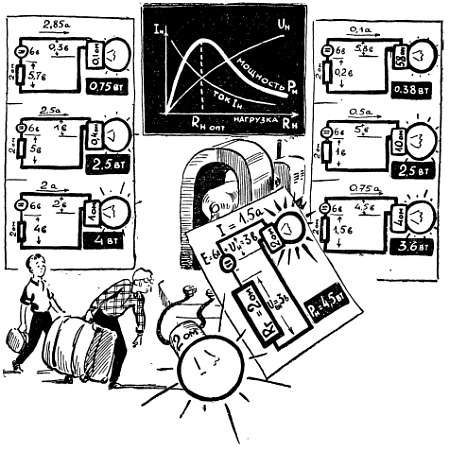 Попробуйте постепенно увеличивать число лампочек, подключаемых параллельно батарейке карманного фонаря. Вы увидите, что, чем больше лампочек, тем более тускло горит каждая из них. Происходит это потому, что потребляемый ток растет, возрастают потери на внутреннем сопротивлении батареи и напряжение на ее зажимах падает. Естественно, что напряжение на выходе генератора зависит и от самого внутреннего сопротивления.