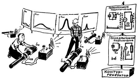 Внутреннее сопротивление контура-генератора зависит от того, как к нему подключить нагрузку. Если подключить Rн параллельно контуру, то он ведет себя как генератор с очень большим эквивалентным сопротивлением — десятки, а иногда сотни ком (верхний листок). Если включить нагрузку в контур последовательно, то он уже представляется генератором с очень небольшим (буквально несколько ом) внутренним сопротивлением (нижний листок). Оба варианта для нас невыгодны — при параллельном подключении к контуру его сопротивление слишком велико, а при последовательном — слишком мало (Воспоминание № 19). А поскольку именно с этим сопротивлением нужно согласовывать нагрузку и поскольку такой нагрузкой является транзистор, можно сказать, что последовательно в контур можно включать входную цепь транзистора, если ее сопротивление очень мало, а параллельно контуру можно подключать входную цепь транзистора, если ее сопротивление очень велико.