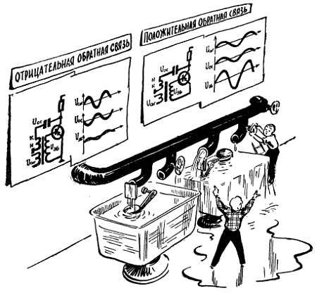 Рис. 85. Положительная обратная связь увеличивает управляющее напряжение, отрицательная обратная связь уменьшает его.