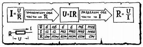 И о нем мы уже говорили не раз. Чтобы не допускать обидных ошибок при расчетах по формулам закона Ома, пользуйтесь приведенной здесь таблицей, в одном из вертикальных столбцов которой вы найдете удобный «комплект» единиц. Если цепь состоит из большого числа элементов, то нужно сначала найти ее общее сопротивление, которое позволит определить общий ток, а затем ток и напряжение на отдельных участках.