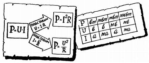 Как известно, мощность — это произведение тока на напряжение. Если неизвестна одна из этих величин, ее легко получить, пользуясь все тем же законом Ома. «Комплекты» единиц для вычисления приведены в таблице.