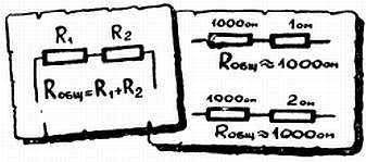 Пример. Если соединить последовательно два резистора R1 = 1000 ом и R2 = 1 ом, то их общее сопротивление Rобщ = 1001 ом. Резистор R2 выглядит на фоне своего коллеги R1 как муха, помогающая волу тянуть плуг.