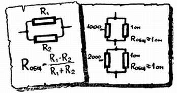 Пример. Включим те же два резистора R1 = 1000 ом и R2 = 1 ом. Нетрудно подсчитать общее сопротивление (произведение нужно делить на сумму) — оно равно 0,999 ом. Параллельно подключенное сопротивление может лишь уменьшить сопротивление участка, и поэтому общее сопротивление всегда меньше наименьшего.