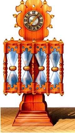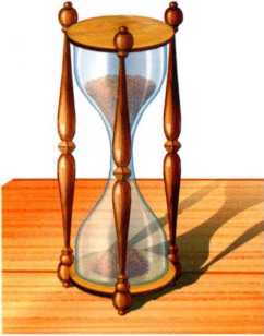 Это — две стеклянные «луковицы», соединенные вместе узким горлышком. Из верхней «луковицы» в нижнюю медленно пересыпается песок. Чем его больше, тем дольше он будет пересыпаться и, значит, тем больше пройдет времени.