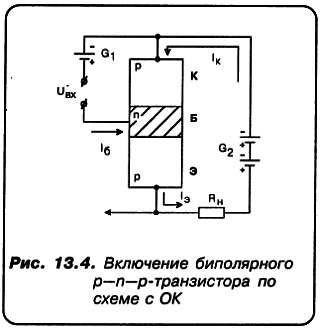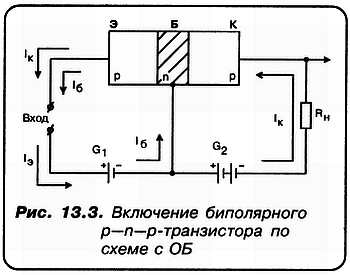 «С»: Совершенно верно! Значит, со спокойной душой переходим к основным схемам включения. Первая из них — схема с ОБЩЕЙ БАЗОЙ или ОБ. Вот как это выглядит в первом приближении (рис. 13.3).