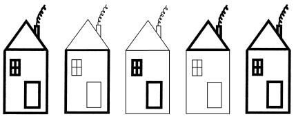 Рис. 28. Методика блуждающего светлого пятна: все картинки серии содержат контур одного и того же рисунка, но в каждой картинке жирной линией выделены только те элементы, о которых Вы говорите в данный момент. Методика позволяет аудитории вникнуть в детали, не теряя из виду общей картины. Вступительные и заключительные фразы Вы проговариваете на фоне полного рисунка (1 и 5-й фрагменты)