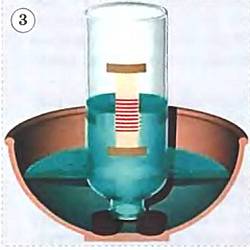 Благодаря этому горлышко бутылки не будет упираться в дно, и вода сможет свободно вытекать из бутылки и затекать в нее. Заткните горлышко бутылки большим пальцем и осторожно установите ее на монеты вверх дном (рис. 3).