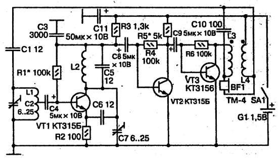 В качестве приемной антенны используется провод от головных телефонов, подключенный через конденсатор С1 к входному контуру L1, С2, настроенному на среднюю частоту диапазона (70 МГц). С контура через конденсатор С4 сигнал поступает на базу транзистора VT1, на котором собран преобразователь частоты с совмещенным гетеродином. Контур гетеродина образован катушкой индуктивности L2 и конденсаторами С5 и С7. Перестройка гетеродина конденсатором С7 производится в пределах от 32,9 до 36,5 МГц. Таким образом, разностная частота между частотой сигнала и второй гармоникой частоты гетеродина попадает в диапазон звуковых частот. Она выделяется на резисторе R3 И через разделительный конденсатор С5 подается на базу транзистора VT2, работающего в каскаде предварительного усиления звуковых частот.