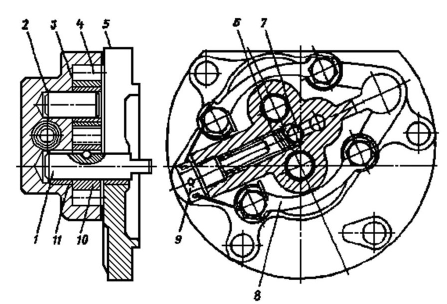 1 – валик ведущей шестерни; 2 – ось ведомой шестерни; 3 – втулка; 4 – ведомая шестерня; 5 – основание; 6 – пружина клапана; 7 – шарик клапана; 8 – стопорная планка; 9 – пробка клапана; 10 – ведущая шестерня; 11 – втулка