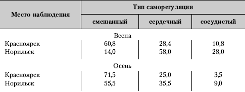 Указанное изменение параметров гемодинамики является, очевидно, общей закономерностью, свойственной детям в весенний период года. В Красноярске энергетически невыгодные для организма типы саморегуляции аппарата кровообращения были отмечены у 39,2 % детей весной и существенно реже осенью – в 28,5 % случаев, еще более резкая разница выявлена у норильских детей, среди которых благоприятный (смешанный) тип саморегуляции весной имели только 14 % обследованных. У большинства был выражен сердечный тип, у более 1/4 детей отмечен наименее выгодный вариант – сосудистый тип саморегуляции.