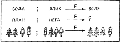 Какой смысл мы вложили в слово «аналогичное», когда говорили о преобразованиях? По крайней мере, двоякий. Во-первых, мы предположили, что элементы, из которых состоят слова и рисунки, как-то соответствуют друг другу. Например, елочки и фигурки из третьей строки ассоциируются у нас с буквами, из которых состоят слова, а буквы важны не сами по себе, а по тому месту, которое они занимают в словах. Во-вторых, мы предполагаем, что сохраняется суть преобразования, хотя элементы, с которыми преобразование оперирует, могут быть другими.