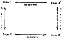 Первая попытка формализовать понятие рассуждения по аналогии была предпринята Лейбницем. В своем сочинении «Фрагменты логики» он ввел понятие пропорции для отношения аналогии. Пропорция Лейбница формулируется следующим образом: «Вещь А так относится к вещи В, как вещь А’ к вещи В’». Обычно пропорцию Лейбница представляют в виде диаграммы: