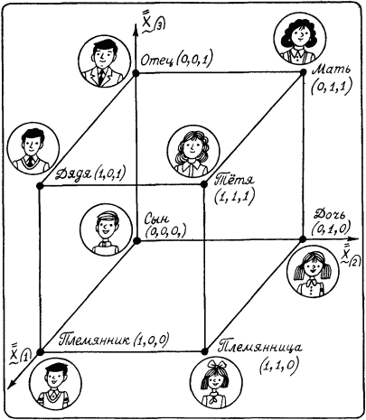 Проиллюстрируем эту мысль, взяв «кусок» пространства Осгуда, относящийся к понятиям, используемым для указания родства. То, что они в семантическом пространстве расположены компактно, было доказано экспериментально. Этот «кусок» пространства Осгуда показан на рис. 25. Для удобства введена система координат и сделано такое преобразование, чтобы все точки, соответствующие интересующим нас понятиям, оказались лежащими в вершинах единичного куба (правомочность такого преобразования в пространстве Осгуда мы тут не обсуждаем).