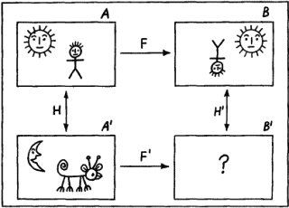 Заметим, что из этого утверждения вытекает, что необходимым условием для возможности рассуждений по аналогии с использованием пропорции Лейбница служит требование коммутативности ее диаграммы. Требование коммутативности диаграммы означает, что описание В’, полученное из A с помощью F и взаимно однозначного соответствия H’, ничем не отличается от описания В’, полученного из A с помощью взаимно однозначного соответствия H и последующего применения к этому результату преобразования F’. С требованием коммутативности диаграмм мы еще столкнемся в последующих разделах этой главы.