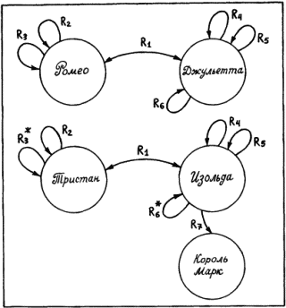 2 и как установить взаимно однозначное соответствие между ними. Возможные в этом случае трудности иллюстрирует рис. 27. На этом рисунке показаны ситуации А и А’. Ситуация А может быть описана следующим текстом: «Ромео любит Джульетту. Джульетта любит Ромео (на рис. 27 это отношение R1). Ромео мужчина (R2). Он итальянец (R3). Джульетта женщина (R4). Она красива (R5). Она не замужем (R6)». Ситуация А’ может быть описана следующим текстом: «Тристан любит Изольду. Изольда любит Тристана (R1). Тристан мужчина (R2). Он бретонец (R*2). Изольда женщина (R4). Она красива (R5). Она замужем (R*6). Ее муж – король Марк (R7)».