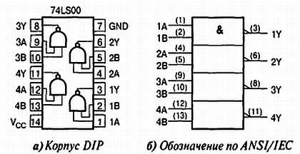 Цоколевка микросхемы 74LS00 в корпусе DIP показана на Рис. 2.1, а. Функция этой микросхемы полностью описывается четырьмя двухвходовыми элементами И-НЕ в положительной логике, поскольку НИЗКИЙ и ВЫСОКИЙ логические уровни эквивалентны логическим значениям 0 и 1. Если же принять, что 0 соответствует ВЫСОКОМУ уровню, а 1 — НИЗКОМУ (отрицательная логика), то микросхема будет выполнять функцию четырех двухвходовых элементов ИЛИ-НЕ. На изображениях логических элементов по стандарту ANSI/IEC[26] НИЗКИЙ уровень обозначается символом полярности