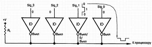 , используемый для обозначения выхода с открытым коллектором. Предположим, что на рисунке изображены четыре периферийных устройства, любое из которых может обращаться к процессору (компьютеру или микроконтроллеру). Если этот процессор имеет только один вход для внешнего сигнала прерывания, то четыре сигнальные линии от устройств должны быть объединены вместе по схеме монтажное ИЛИ, как показано на рисунке. Когда все сигнальные линии находятся в неактивном состоянии (лог. 0), выходы всех буферных элементов НЕ выключены (ВЫСОКИЙ уровень) и общая линия подтянута к Vcc резистором RL. Если какая-либо из сигнальных линий становится активной (лог. 1), скажем, линия Sig_1, то на выходе соответствующего буфера появляется НИЗКИЙ уровень. В результате, независимо от состояния остальных сигнальных линий, общая линия переключается в состояние НИЗКОГО уровня, прерывая таким образом работу процессора.