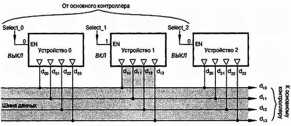 В качестве примера использования выхода указанного типа рассмотрим ситуацию, показанную на Рис. 2.4. В данном случае основному контроллеру требуется прочитать данные с одного из нескольких устройств, подключенных к нему группой общих линий. Поскольку эта магистраль, или, иначе, шина данных, является общим ресурсом, в любой момент времени доступ к шине предоставляется только выбранному устройству. Доступ должен быть закрыт сразу же после считывания данных, с тем чтобы шиной могло воспользоваться другое устройство. Как показано на рисунке, все выходы, подключаемые к шине, обозначаются символом