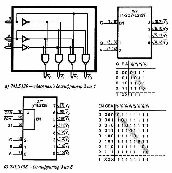 Рис. 2.5. Микросхемы дешифраторов 74LS138 (К555ИД7) и 74LS139 (К531ИД14)