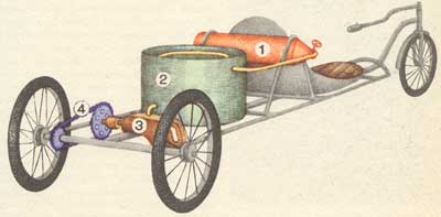Разумеется, я не мог отказать себе в удовольствии проверить такой «гибридный» накопитель в действии и сделал небольшую тележку – микромобиль. Основой послужил детский педальный автомобильчик – карт, какие продаются в «Детском мире». На тележке я установил баллон углекислотного огнетушителя и соединил его прочным резиновым шлангом с пневматическим гайковертом, приобретенным в магазине инструментов. Гайковерт состоит из пневмодвигателя, работающего от сжатого воздуха, и редуктора, понижающего скорость вращения патрона. С этим патроном я связал цепной передачей одно из задних колес тележки, а второе посадил на ось свободно, на подшипниках.