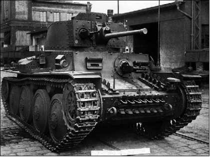 Легкий танк Pz.38(t) Ausf.E или F во дворе завода фирмы ВММ. Обращает на себя внимание массивная прямая лобовая плита корпуса.