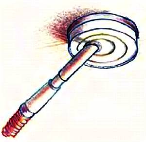 На рисунке показана схема прерывателя воздушного потока. Отметим, что частота следования перерывов в работе присоски тем выше, чем меньше ее объем. Это связано с резонансом воздушных колебаний в ее объеме. (Точнее говоря, она обратно пропорциональна квадратному корню из ее объема.) Поэтому сделаем присоску минимального объема и удлиненной формы. С такими, кстати, мадам Муше XXI века могла бы лихо носиться по потолку с батарейным пылесосом за спиной.
