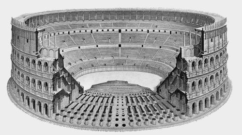 В нижней части здания располагались места для римских вельмож и трон для императора под высоким балдахином. Потолка не было. Хитроумная система канатов и блоков позволяла натягивать на мачтах парусиновый тент, защищавший зрителей от дождей и палящего солнца.