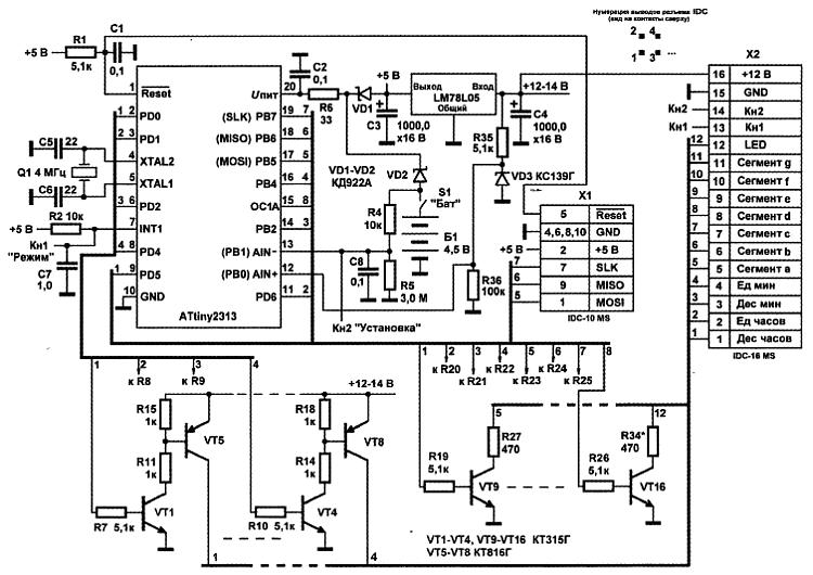 Рис. 20.1. Схема часов на МК ATtmy2313 (плата управления)