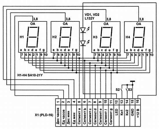 Часы мы сделаем на основе светодиодных индикаторов — поскольку схема все равно будет потреблять довольно много, то так или иначе потребуется сетевой источник питания, и слепые ЖК-индикаторы ставить нет особого смысла. Также договоримся, что секунды мы не показываем (в настольных часах этого никто и не делает, заменяя их отсчет миганием разделительной точки или двоеточия).