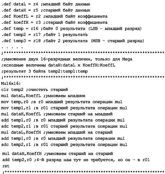 А вот с умножением и делением несколько сложнее. Выполнение типовых операций на AVR для чисел с различной разрядностью, вообще говоря, приводится в фирменных руководствах по применению: «аппнотах» (Application Notes, в данном случае номер 200). Но эти процедуры для наших целей все равно придется творчески переработать. Поэтому мы не будем на них останавливаться, а сразу воспользуемся тем обстоятельством, что для контроллеров семейства Mega определены аппаратные операции умножения. Тогда и алгоритм сильно упрощается и легко модифицируется для любого размера операндов и результата. Вот так выглядит алгоритм для перемножения двух 16-разрядных сомножителей с получением 24-разрядного результата (в названиях исходных переменных отражен факт основного назначения такой процедуры — для умножения неких данных на некий коэффициент[37]):
