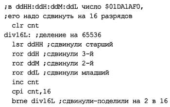 Деление — значительно более громоздкая процедура, чем умножение, требует больше регистров и занимает больше времени. Операции деления двух чисел (и 8- и 16-разрядных) приведены в той же «аппноте» 200, но они не всегда удобны на практике: часто нам приходится делить результат какой-то ранее проведенной операции умножения или сложения, а он нередко выходит за пределы двух байтов.