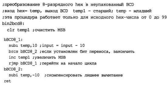 Некоторые процедуры для преобразования в BCD-формат содержатся в фирменной Application notes 204. Приведем здесь вариант такой процедуры, более экономичный в части использования регистров. Исходное hex-число находится в регистре temp, распакованный результат — в tempi: temp. Процедура довольно короткая: