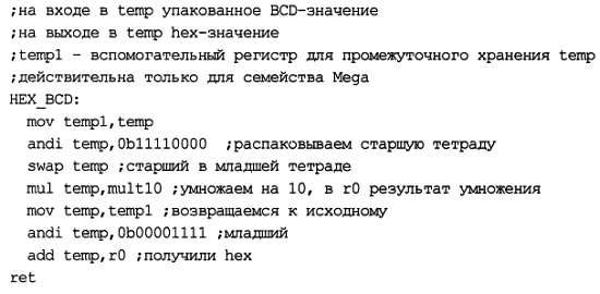 Заодно приведем одно из решений обратной задачи — преобразование упакованного BCD в hex-число, после чего с ним можно производить арифметические действия (хотя в программе далее это нам не понадобится). По сравнению с «фирменной» BCD2bin8 эта процедура хоть и немного длиннее, но понятнее и более предсказуема по времени выполнения: